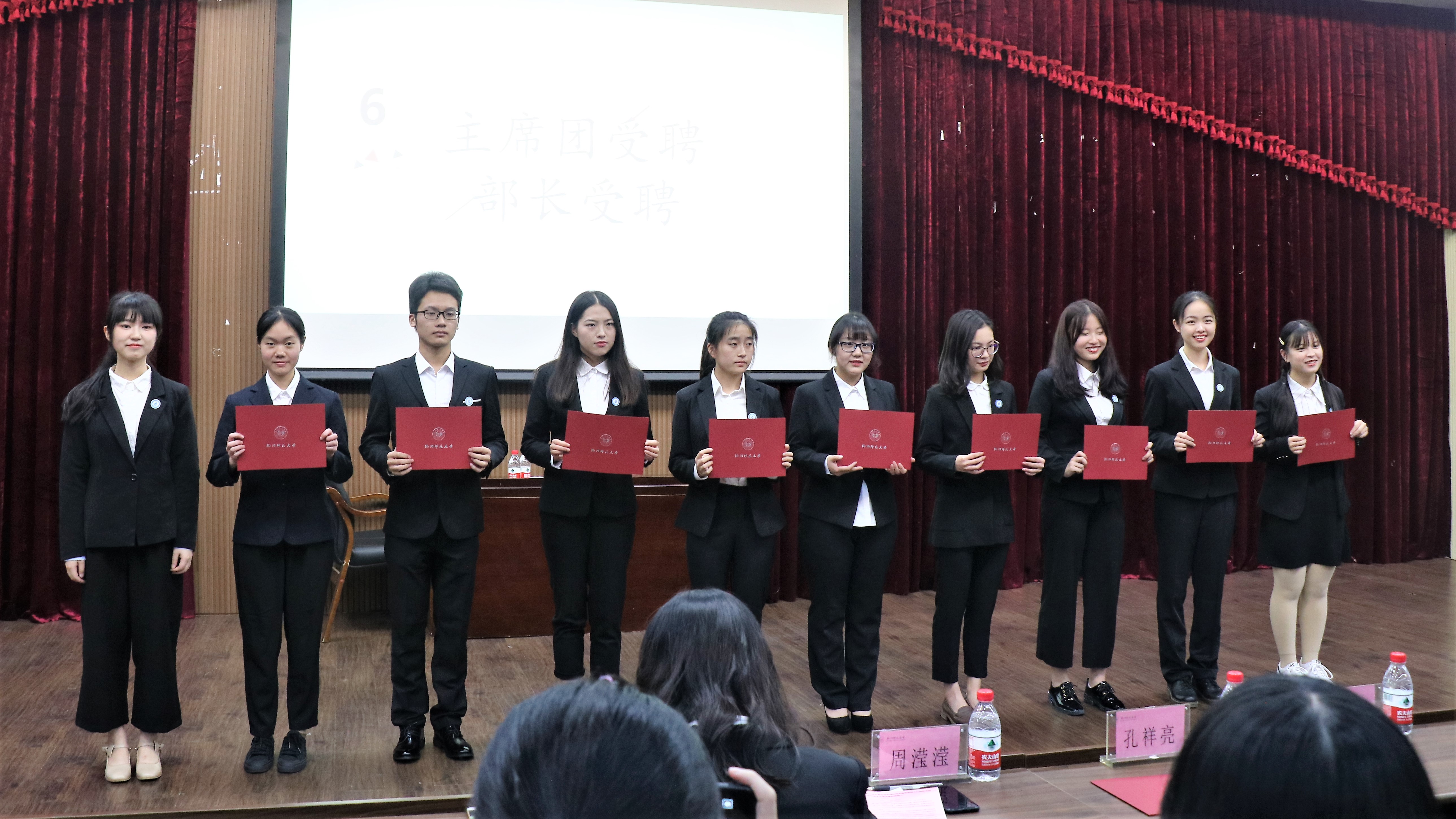 发言结束后,主席团和部长受聘仪式正式开展。伴随着神圣的背景音乐,主席团上台接受孔祥亮老师颁发的证书。接着,主席为各自分管的部门部长颁发证书,并合影留念。最后,依次上台的22个部门干事代表接受主席佩戴的团学徽章,同时各部门部长给干事颁发聘书。