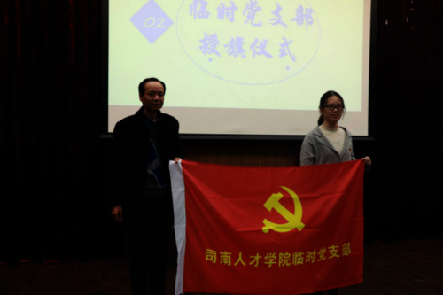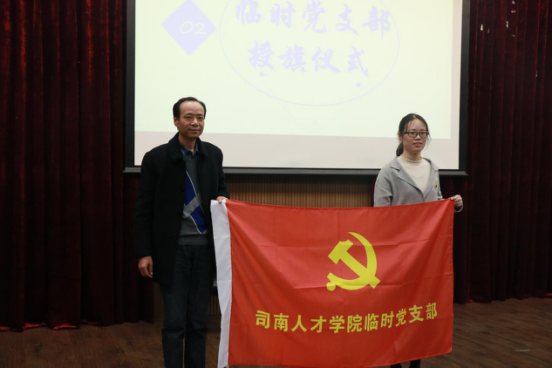 全体学员起立奏唱国歌后,现场举行了临时党支部授旗仪式,由吴兴农书记向临时党支部书记高露薇授旗,旗帜的传递意味着福利姬 党委在培养学生干部上的重任的传递。随后,吴书记和管书记为上台的学员代表佩戴司南徽章。