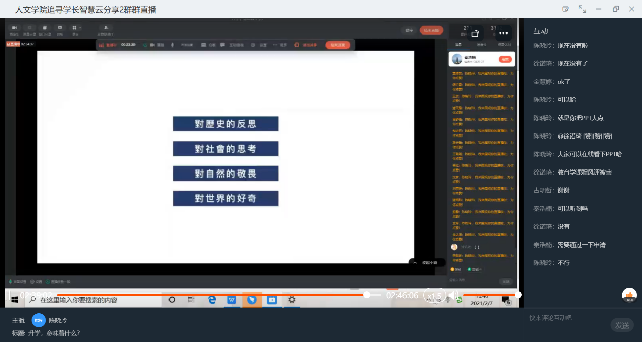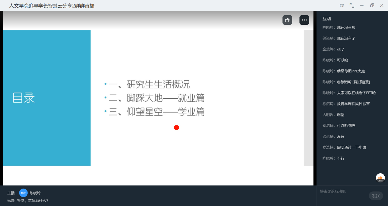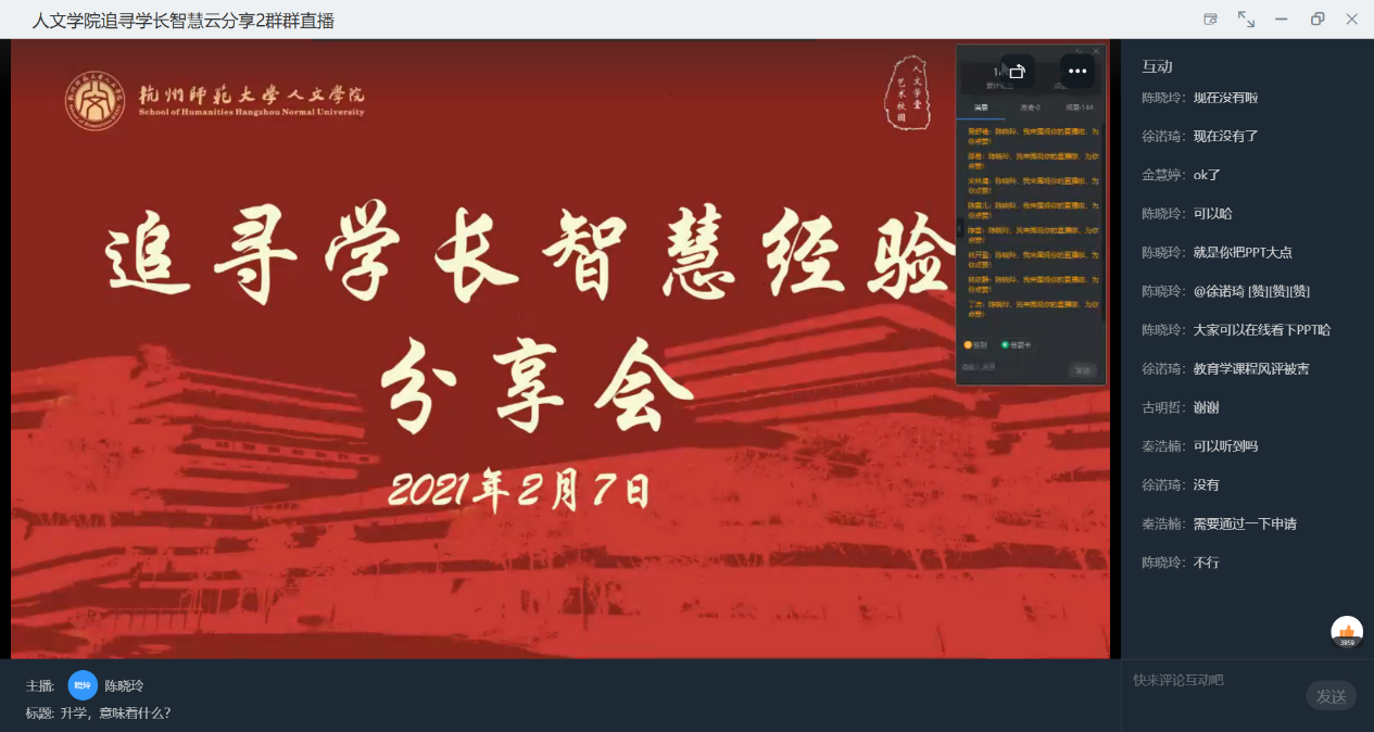 2021年2月7日14:00,福利姬 于钉钉平台顺利举办追寻学长智慧之经验分享会系列讲座——“升学,意味着什么?”。讲座由由福利姬学工办主任陈晓玲主持。本次讲座共有270人参加,点赞数高达3960次。