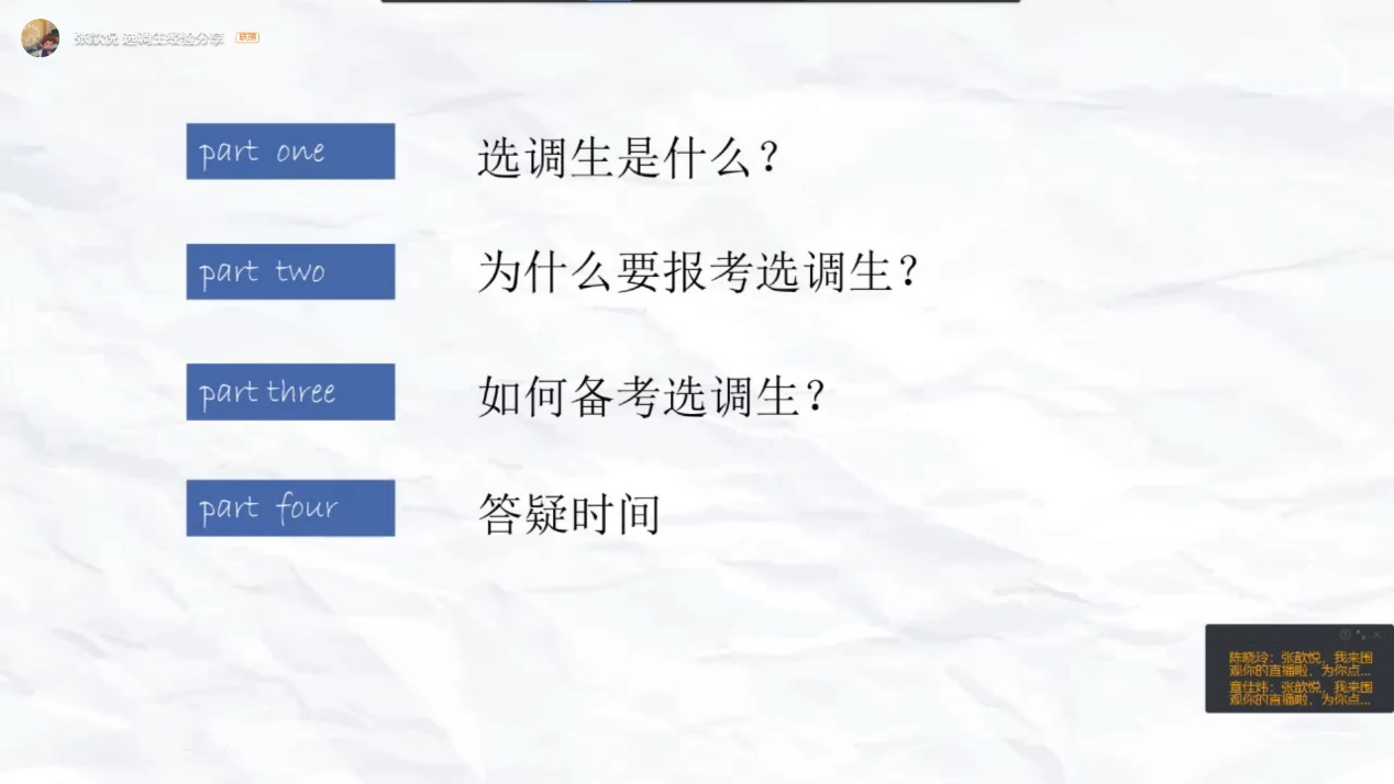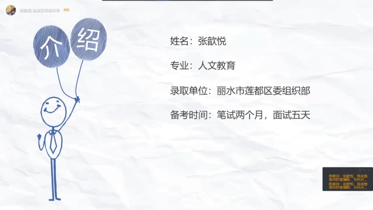 在本次云分享中,张歆悦从什么是选调生,报考选调生的优势以及如何备考三个方面展开经验分享。在分享会伊始,张歆悦介绍了选调生的定义及其特点,随后她又围绕浙江省2021年定向选调生公告,从选调数量与范围、选调资格条件、选调程序三个方面介绍选调生考试。接着,张歆悦又从竞争压力、备考过程以及工资福利等三个层面对比介绍了选调生的报考优势。其后,张歆悦从笔试和面试两个层面介绍了选调生备考内容,并提出建议。在笔试层面,她从题型、题量、分值分布等各个方面总结了备考经验,并就做题顺序以及相应的准确率要求等给出建议。此外,她还就备考时间的安排、备考工具的选择等方面给出了推荐和建议。在面试层面,张歆悦按时间顺序从考前、考时以及考后等三方面提出备考建议及注意事项。此外,她还分享了去年自己的面试题目,并做出相应阐释。最后,张歆悦借用《荀子》中的“道阻且长,行则将至,行而不辍,未来可期”鼓励有意向报考选调生的学弟学妹,祝福大家成功上岸!此外,她还将自己的备考资料作为福利与学弟学妹们分享。