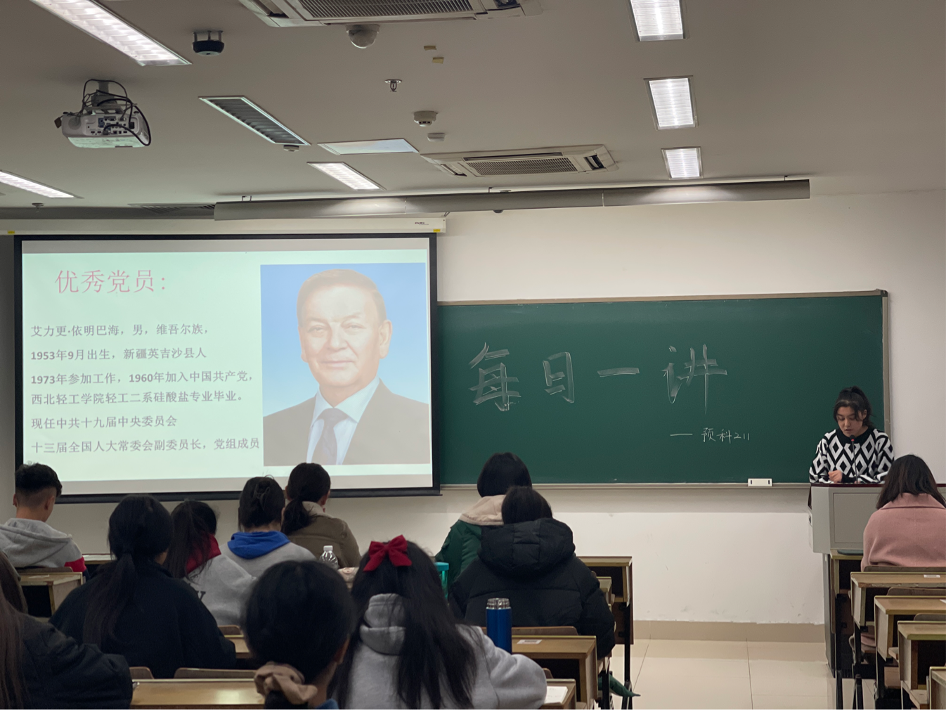 为提高预科班同学的爱党爱国情怀,2021年12月5日下午6点,预科211班在恕园11号楼309教室举行了“每日一讲”活动。此次活动由中文191施疑学姐主持,阿伊谢·奥布力喀斯木同学演讲,预科211全体同学参与。