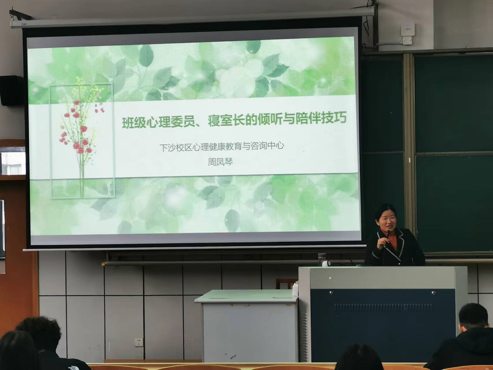 周老师以“班级心理委员、寝室长的职责与功能”的主题,聚焦心里健康日常工作,形象地将心理委员和寝室长的角色定位为“心理气象员”,从观察、倾听与观察三大步骤进行详细说明。对于观察层面,周老师详细描述了特别需要关注的六种学生,并以抑郁症和双相情感障碍为例,希望心理委员和寝室长及时发现同学们发出的信号;对于倾听层面,周老师表示倾听是沟通中占比最大的行为,同时向心理委员和寝室长讲解了倾听的技巧、要素与雷区,在此基础上两两一组进行了倾听的练习,增进了心理委员与寝室长对倾听的理解;对于预报层面,周老师提出两个关键,即客观描述和主观感觉,需要心理委员和寝室长从各方面具体地并根据个人直觉进行同学状况的描述,以此来得到更好的反馈效果。最后,通过现场互动与答疑,周老师的讲解得到了良好的反馈,心理委员及寝室长的问题得到了详尽的答复。