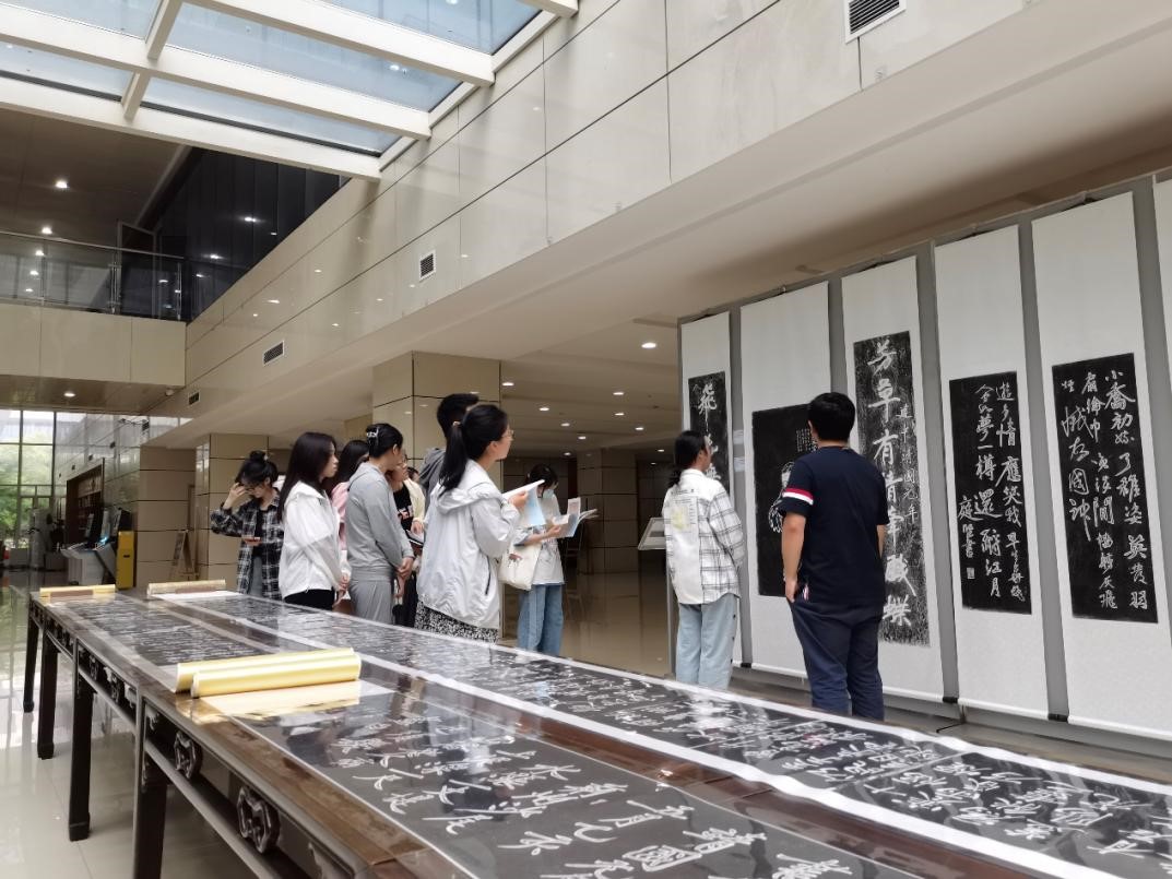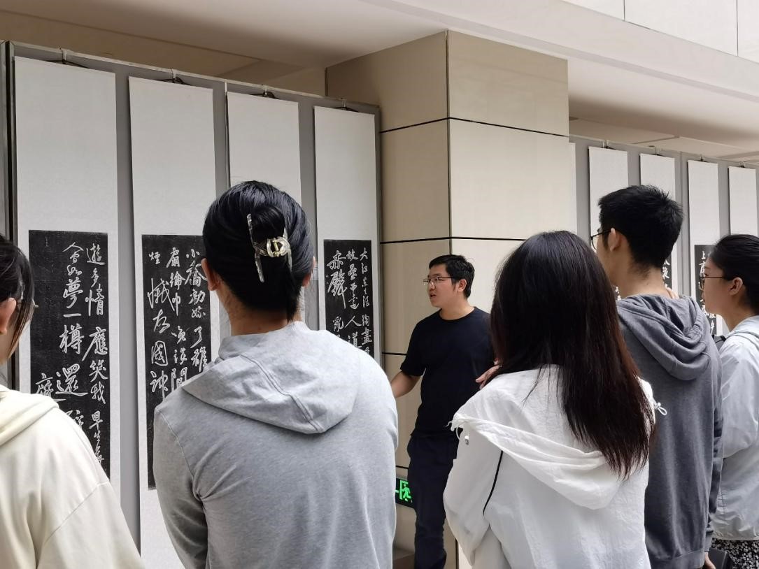 随后,同学们跟随余辉老师的介绍逐一欣赏展厅内的碑刻拓片。碑文拓片通过拓片等形式的方式保存了丰富的历史信息、人物情状与宋人对于生命意义的探索,并传达给千年以后的今人,使得我们得与宋人直面对话。透过黄庭坚的作品,同学们了解了诗文内容、字体形制、碑刻样式、两宋政治与社会文化等等,一睹宋韵辉煌文化的丰盈饱满,参悟黄庭坚书法蕴藏在背后的精神气韵,特别是对北宋晚期艺术大家辈出的时代有了直观的感受。