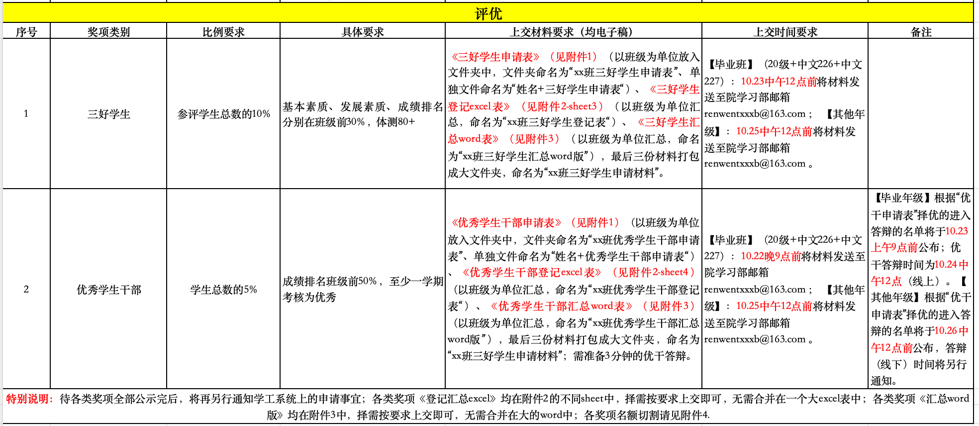 1.各班级要充分认识做好学生评奖评优工作的重要性,要严格按照“评选条件公开、评选名额公开、程序办法公开、评选结果公开”的原则做好各项评选工作,评选过程中要严格按照相关制度和规范流程执。