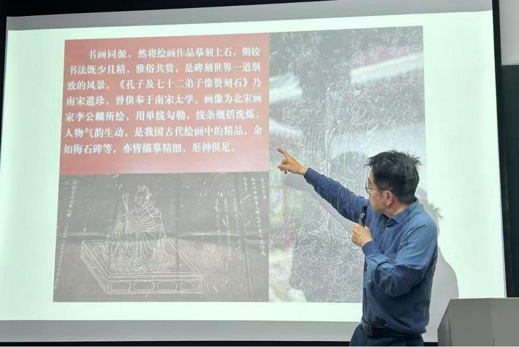 讲座伊始,吴教授先带领大家概览杭州城地图,再沿着“杭州孔庙-钱王祠-西湖十景-栖霞岭岳王庙-孤山林逋墓”的路线展开寻宋旅程。其中对家喻户晓的或名不见经传的遗址均有所提及,有御街、通玄观造像、皇城遗址、和宁门、八卦田郊坛、淳化阁帖、六和塔、过溪亭等,于此可见其研究之细致深入。