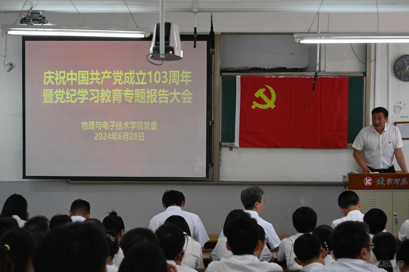 党委举办庆祝中国共产党成立103周年暨党纪学习教育专题报告大会,学院全体师生党员参加会议,大会由学院党委副书记雷鸣主持。