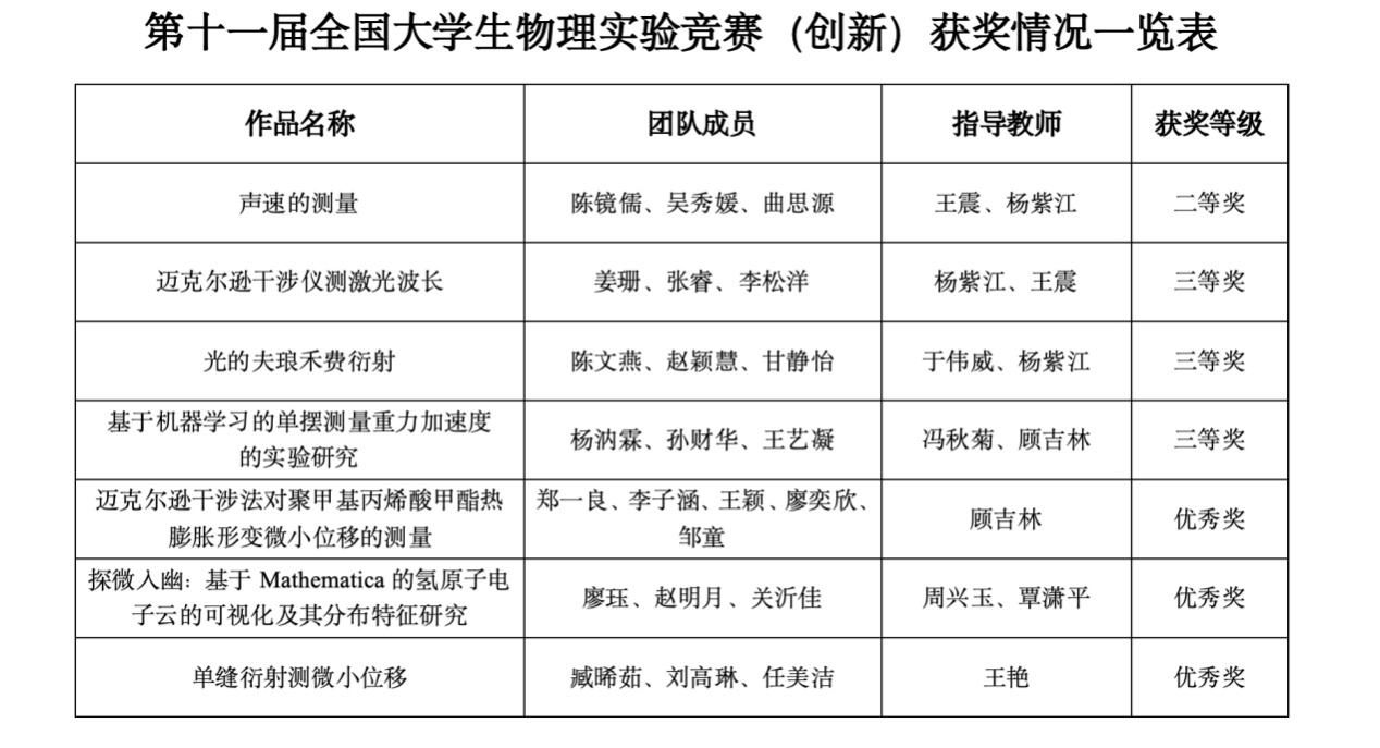 推选的讲课类作品《声速的测量》荣获国家级二等奖,讲课类作品《迈克尔逊干涉仪测激光波长》、命题类作品《光的夫琅禾费衍射》和《基于机器学习的单摆测量重力加速度的实验研究》荣获国家级三等奖,自选类作品《探微入幽:基于Mathematica的氢原子电子云的可视化及其分布特征研究》、命题类作品《单缝衍射测微小位移》和《迈克尔逊干涉法对聚甲基丙烯酸甲酯热膨胀形变微小位移的测量》荣获国家级优秀奖。